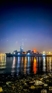 Kareye ilk baktığınızda gözünüzü alamadığınız o devasa yapı, borda numarasından da anlaşılabileceği üzere F256 (TCG Gediz) fırkateyni. Gündüzleri sahip olduğu o sert ve askeri duruş, gece karanlığında liman ışıklarıyla aydınlandığında yerini adeta görsel bir şölene bırakıyor. Geminin silüeti, gece mavisinin tonlarıyla harika bir kontrast oluştururken, güvertesindeki detaylar ve arka kısımdaki helikopter, bu devasa makinenin her an göreve hazır olduğunu sessizce fısıldıyor.